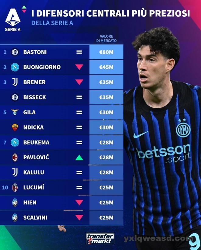 北京时间12月24日,在更新了意甲球员的身价之后,德转列出了目前意甲身价最高的10名中后卫,巴斯托尼8000万欧元断档第一,布翁焦尔诺4500万欧元第二,布雷默和比塞克3500万欧元并列第三。