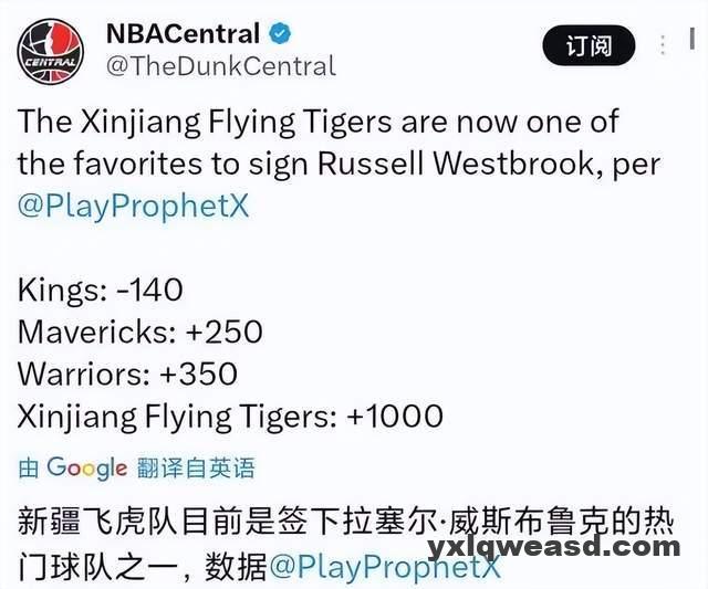 CBA联赛又要迎来NBA巨星了吗,拥有百万粉丝的知名篮球媒体NBACentral爆料:新疆飞虎男篮是目前签下威斯布鲁克的热门球队之一。在威少的下家赔率榜上,CBA联赛的新疆队高居第四,仅次于NBA的国王、独行侠以及勇士,威少加盟新疆队的可能性比去欧洲联赛还高。