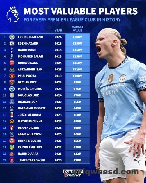 北京时间11月11日,德转统计出了本赛季英超20家俱乐部历史身价最高的球员,2024年身价曾达到2亿欧元的哈兰德独自领跑,阿扎尔、哈里-凯恩、萨拉赫以及萨卡1.5亿欧元并列第2。