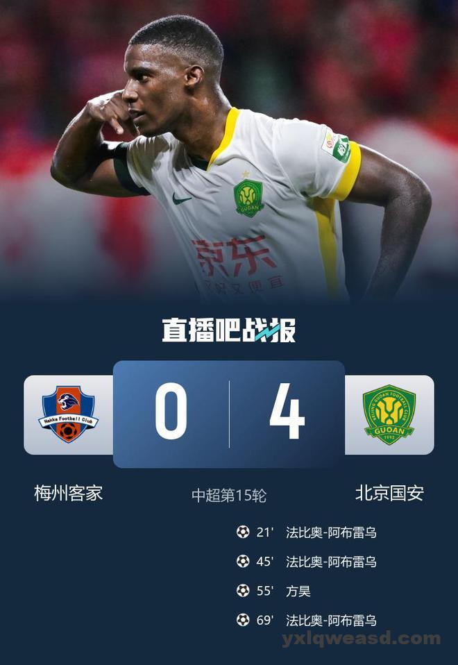 直播吧6月25日讯 北京时间6月25日19点35分,中超第15轮,梅州客家在主场五华奥体中心惠堂体育场迎战北京国安。上半场,法比奥梅开二度。下半场,曹永竞助攻方昊破门,法比奥完成帽子戏法。最终北京国安4-0大胜梅州客家。