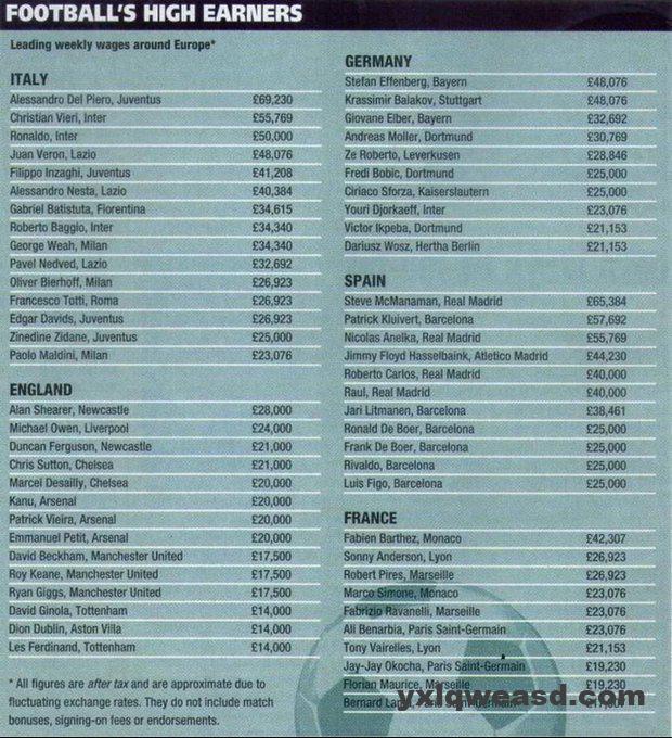 欧洲主要联赛周薪排行榜(税后,单位:英镑)注:所有数据均为税后收入,因奖金、签字费或代言等因素影响,仅为近似值。德国斯特凡·埃芬伯格(拜仁慕尼黑):48076吉奥瓦尼·埃尔伯(拜仁慕尼黑):32692安德烈亚斯·默勒(多特蒙德):30769泽·罗伯托(勒沃库森):28846弗雷迪·博比奇(多特蒙德):25000意大利亚历山德罗·德尔·皮耶罗(尤文图斯):69230罗纳尔多(国际米兰):55769克里斯蒂安·维埃里(国际米兰):50000胡安·贝隆(拉齐奥):48076菲利波·因扎吉(尤文图斯):40384亚历山德罗·内斯塔(拉齐奥):40384加布里埃尔·巴蒂斯图塔(佛罗伦萨):34615罗伯托·巴乔(国际米兰):34340乔治·维阿(AC米兰):34340帕维尔·内德维德(拉齐奥):32692克劳迪奥·萨福扎(凯泽斯劳滕):26923尤里·德约卡夫(国际米兰):23076西班牙史蒂夫·麦克马纳曼(皇家马德里):65384帕特里克·克鲁伊维特(巴塞罗那):57692尼古拉·阿内尔卡(皇家马德里):55769吉米·弗洛伊德·哈塞尔巴因克(马德里竞技):44230保罗·马尔蒂尼(AC米兰):40000罗伯托·卡洛斯(皇家马德里):40000劳尔(皇家马德里):40000贾里·利特马宁(巴塞罗那):38461弗朗西斯科·托蒂(罗马):26923奥利弗·比尔霍夫(AC米兰):26923齐内丁·齐达内(尤文图斯):26923埃德加·戴维斯(尤文图斯):23076英格兰大卫·贝克汉姆(曼联):26923罗伊·基恩(曼联):26923瑞恩·吉格斯(曼联):26923迈克尔·欧文(利物浦):24000克里斯·萨顿(切尔西):21000莱斯·费迪南德(热刺):21153帕特里克·维埃拉(阿森纳):20000埃马纽埃尔·佩蒂特(阿森纳):20000努坎·卡努(阿森纳):20000大卫·吉诺拉(热刺):14000迪昂·达布林(阿斯顿维拉):14000法国法比安·巴特兹(摩纳哥):42307索尼·安德森(里昂):26923马尔科·西蒙尼(摩纳哥):23076法布里齐奥·拉瓦内利(马赛):23076阿里·贝纳比亚(巴黎圣日耳曼):23076托尼·瓦雷尔(里昂):21153弗洛里安·莫里斯(马赛):19230罗贝尔·皮雷斯(马赛):17500伯纳德·拉玛(巴黎圣日耳曼):17307杰杰·奥科查(巴黎圣日耳曼):14000