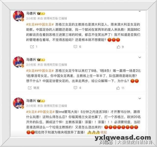 看到中国女足连输两场比赛败仗,尤其是2-3输给苏格兰,马德兴直接坐不住,深夜连发3条动态怒骂。
