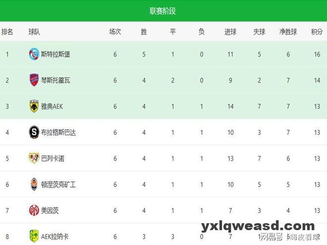 联赛阶段所有比赛结束后,斯特拉斯堡5胜1平,无可争议地拿下第一名,这支被戏称为切尔西二队的法甲劲旅,本赛季表现相当出色,目标显然是剑指冠军。西甲的巴列卡诺,以及德甲的美因茨,末轮双双获胜,成功保住前八名,可以直接晋级16强。