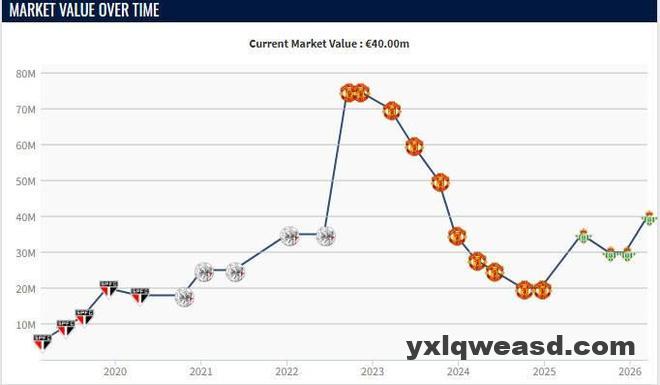 这位巴西边锋的巅峰身价是2022年9月的7500万欧元,那年夏窗,他以9500万欧元的转会费从阿贾克斯转会曼联,不过自那之后,由于表现不佳,他的身价一直在下跌,在曼联时曾跌到了2000万欧