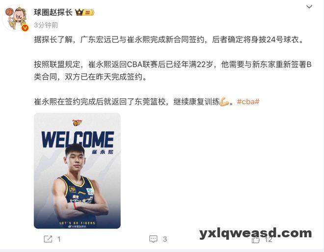 北京时间9月17日,中国男篮新星崔永熙结束短暂的NBA追梦之旅,此前广东男篮已经官宣交易得到崔永熙。如今根据媒体人球圈赵探长报道,广东男篮已经与崔永熙完成新合同签约(B类合同),新赛季将身披24号球衣征战。