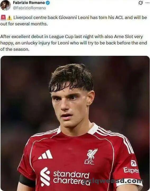 名记罗马诺报道:“利物浦中后卫莱奥尼遭遇十字韧带撕裂,将缺席数月。”