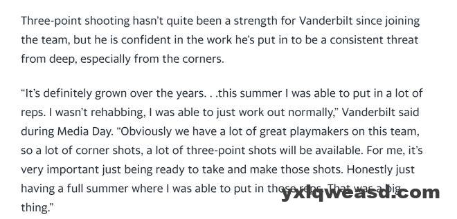 “这些年来,我的三分球确实进步了……今年夏天我进行了很多的训练。我不是进行康复训练,只是正常地训练,显然,我们队里有很多优秀的组织核心,所以有很多底角投篮和其他位置的三分投篮机会。对我来说,做好准备出手并且命中这些投篮非常重要。说实话,整个夏天我都能够进行这些训练。这对我来说意义重大。”范德比尔特说道。