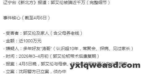近日,国内媒体报道近期郭艾伦与家人,被多年好友“涛哥”诈骗,损失近千万元。