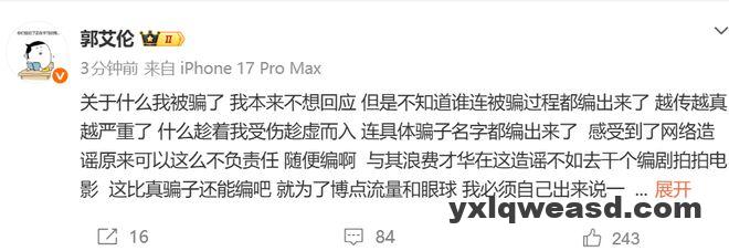 “感受到了网络造谣,原来可以这么不负责任,随便编啊!与其浪费才华在这造谣,不如去干个编剧,拍拍电影。这比真骗子还能编吧!就为了博点流量和眼球,我必须自己出来说一句了:我没有被骗,谢谢大家关心。”
