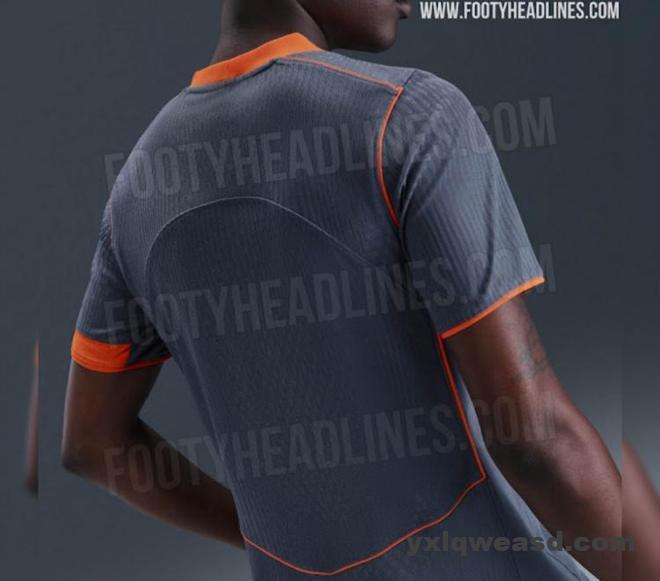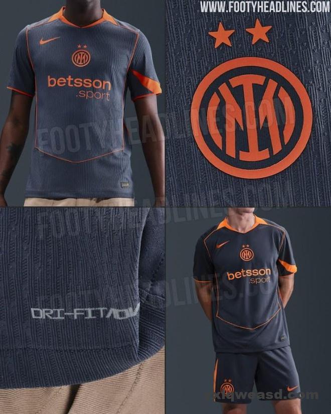 这款球衣采用深蓝色(雷霆蓝)为主色调,并配以醒目的橙色标志和装饰(安全橙)。设计灵感来源于2000年代中期的Total 90系列,这款耐克为国际米兰打造的25-26赛季第三球衣将于2025年9月上市。