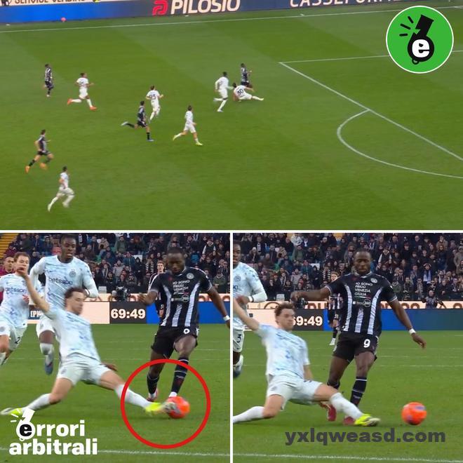 比赛第70分钟左右,随着乌鸡连续换上进攻球员加强攻势,国米球员体能不足的问题逐渐暴露出来,这时候裁判还来加戏!在乌迪内斯的一次快速反击中,拖在防线最后的奥古斯托完成精准铲断,慢镜头可以清晰看到奥古斯托是先碰到了球,可裁判却吹罚铲球犯规,给了奥古斯托一张黄牌!要知道,如果奥古斯托真的犯规,作为防线最后一名防守球员,阻挡了对方单刀球的机会,这应该直接给红牌才对,可裁判却给出了黄牌+定位球,明显不合理!