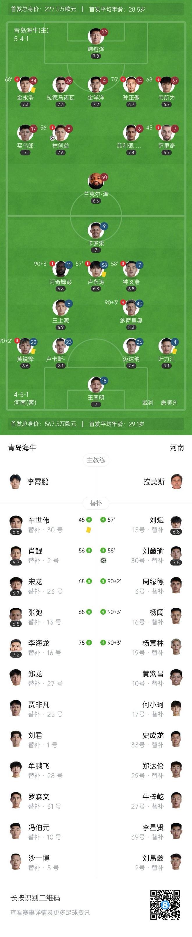 直播吧8月29日讯 北京时间8月29日19:00,中超第23轮,青岛海牛坐镇青岛青春足球场迎战河南队。上半场,阿奇姆彭进球越位在先,王国明奉献神扑,林创益补时破门;下半场,纳萨里奥助攻,刘鑫瑜凌空打门扳平比分。最终,青岛海牛1-1战平河南队遭遇3轮不胜,先赛一场积16分仍居第15位,落后保级区1分,河南队积23分暂居第11位。