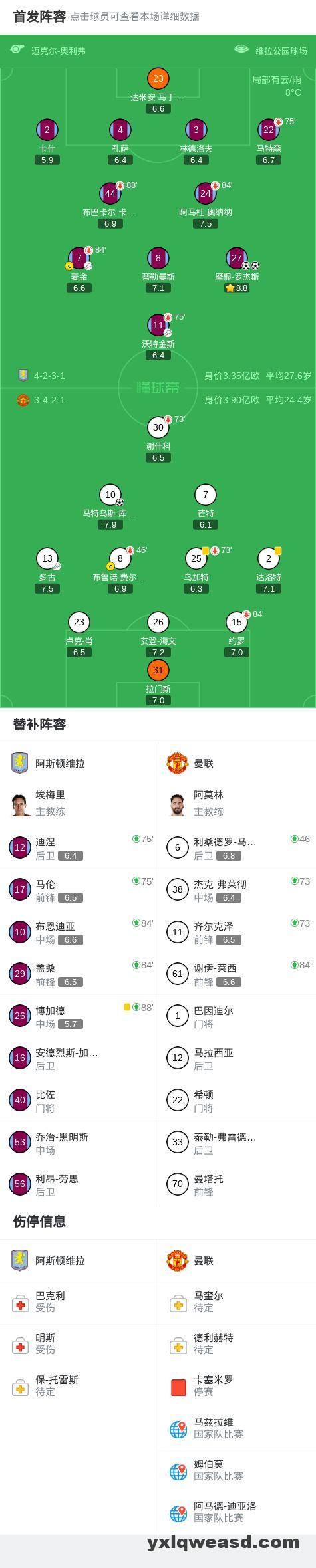 第45+3分钟,多古抢断卡什送助攻,库尼亚兜射破门,曼联1-1扳平维拉!