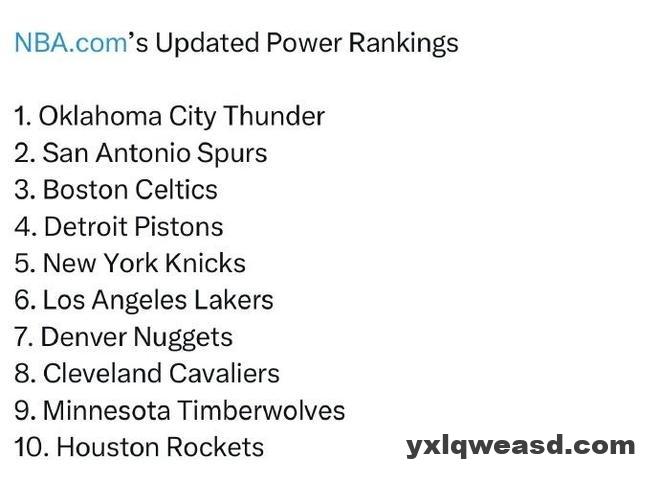 NBA官宣联盟最新球队战力榜,联盟战绩前二的雷霆和马刺稳居前二,凯尔特人反超东部第一的活塞升至战力榜第三,湖人第六,火箭下滑至第十。