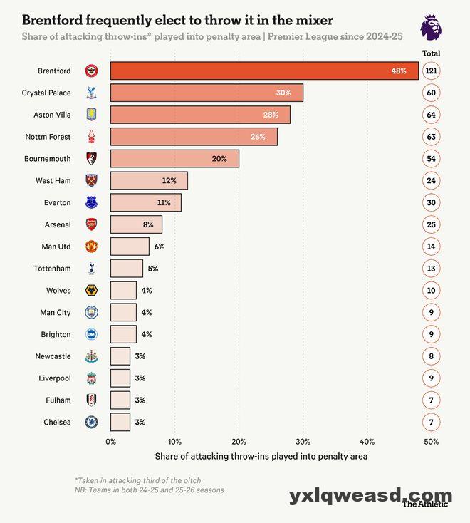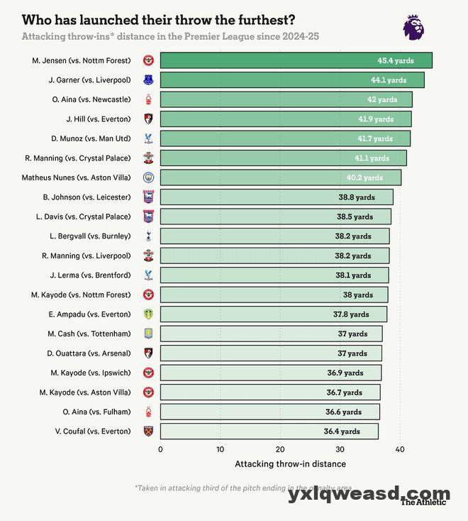 值得一提的是,布伦特福德还拥有英超中掷出最长界外球的球员,马蒂亚斯-延森在上个月对阵诺丁汉森林的比赛中掷出了45.4码的距离,这是自上赛季以来最长的进攻性界外球。