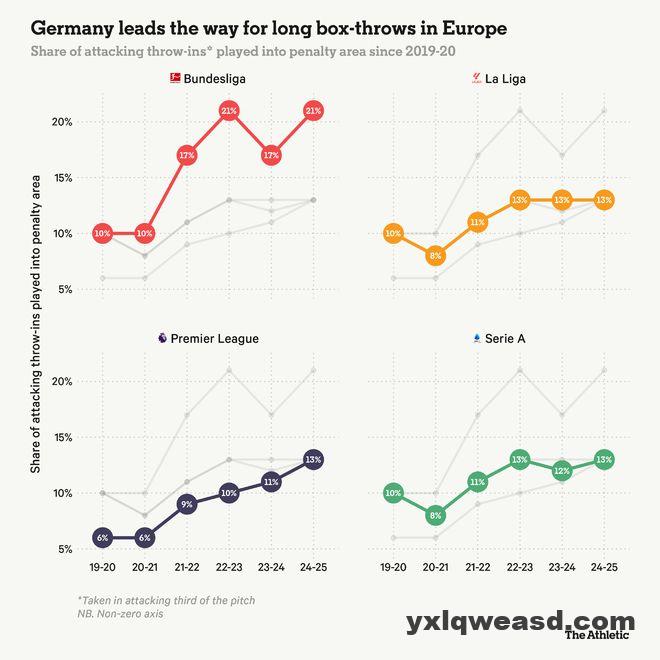 有趣的是,英超并非欧洲大陆大力界外球趋势的引领者。尽管自2019-20赛季以来,英超的使用率逐年上升,但德甲才是欧洲四大顶级联赛中大力界外球的最大拥趸。