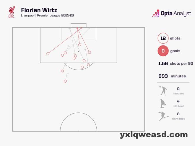 英超11轮过后,利物浦新援维尔茨仍未取得进球,也没有助攻入账,数据相当惨淡。