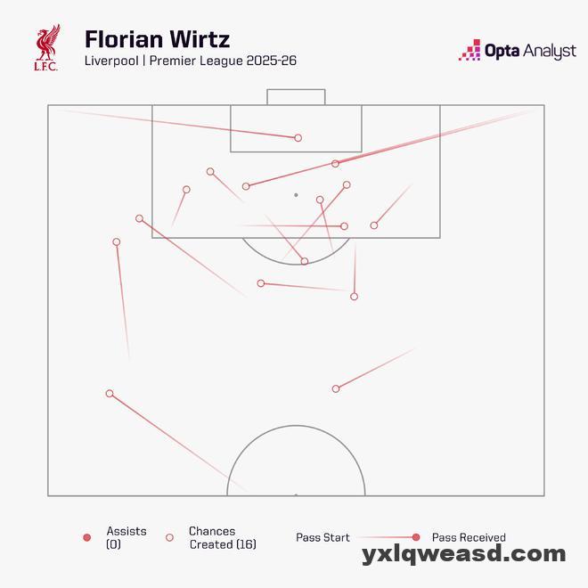 考虑各项赛事,维尔茨已经为利物浦出场16次,未斩获进球,有3次助攻入账。