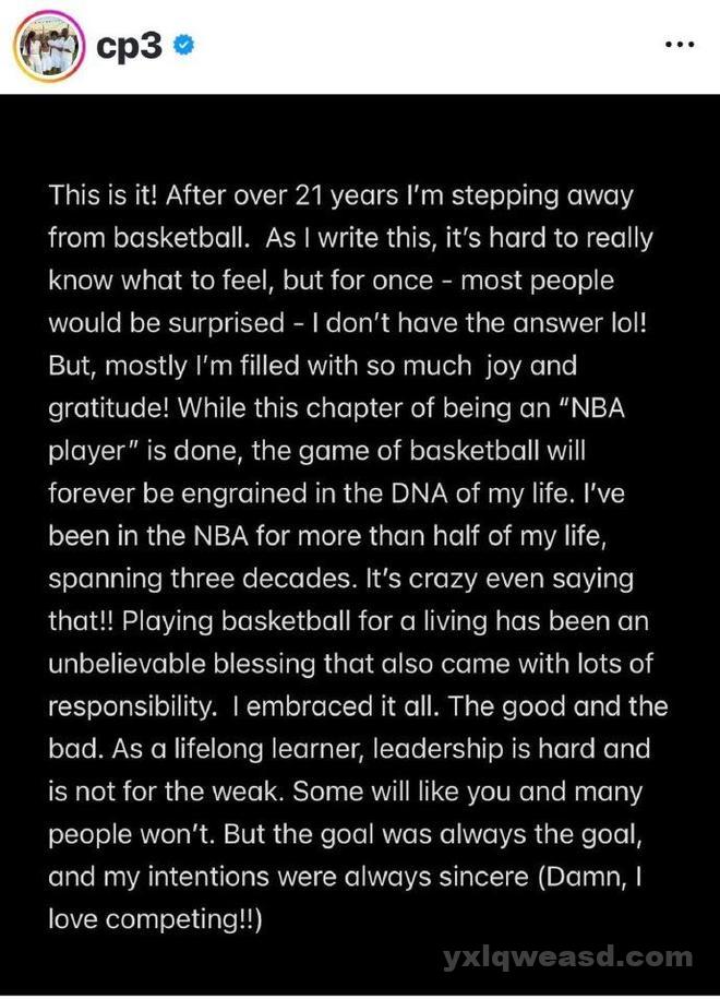 就这样,在经历超过21年NBA生涯后,我将告别篮球生涯。当我写下这些文字,我确实很难真正去体会内心情感,但这一次大多数人可能会感到惊讶,对此我并没有答案。