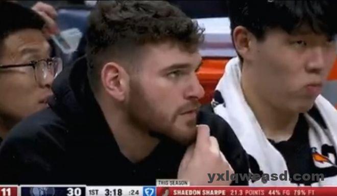 开拓者首节就挖下大坑被灰熊压制,杨瀚森不到4分钟2次犯规被换下场后努嘴,克林根因伤缺席坐在身边。