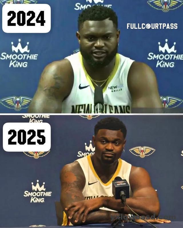 第一眼看到锡安,你是真的认不出这是曾经的胖虎,还以为兰德尔什么时候转会到鹈鹕了。以前的大脸圆圆乎乎的,现在有棱有角。媒体晒出了去年媒体日的锡安和今年的对比图,简直是两个人。