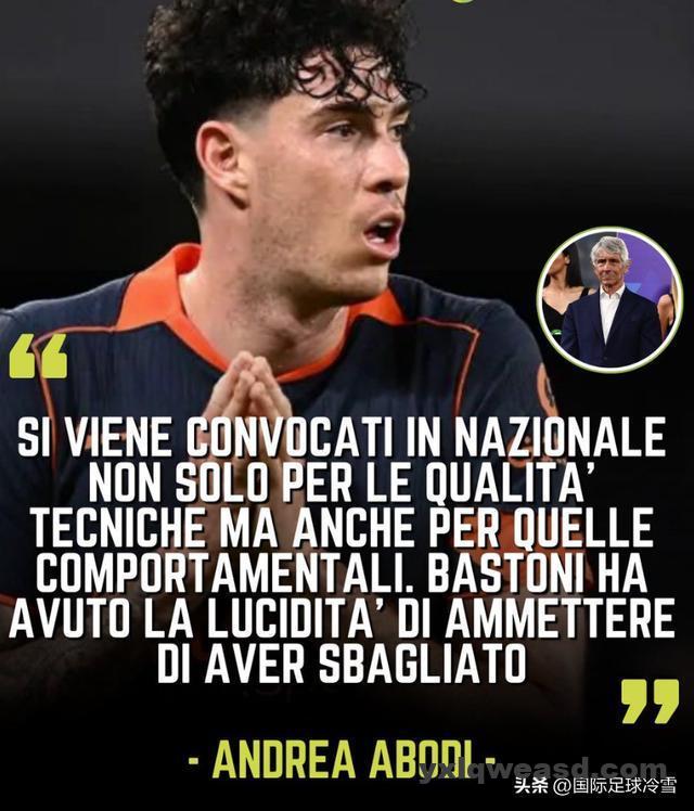 意大利体育部长阿博迪在出席公开活动时,接受采访时表示:“应不应该将巴斯托尼排除出国家队?我认为球员入选国家队不仅取决于能力,也取决于行为,巴斯托尼足够清醒,承认了自己的错误……”