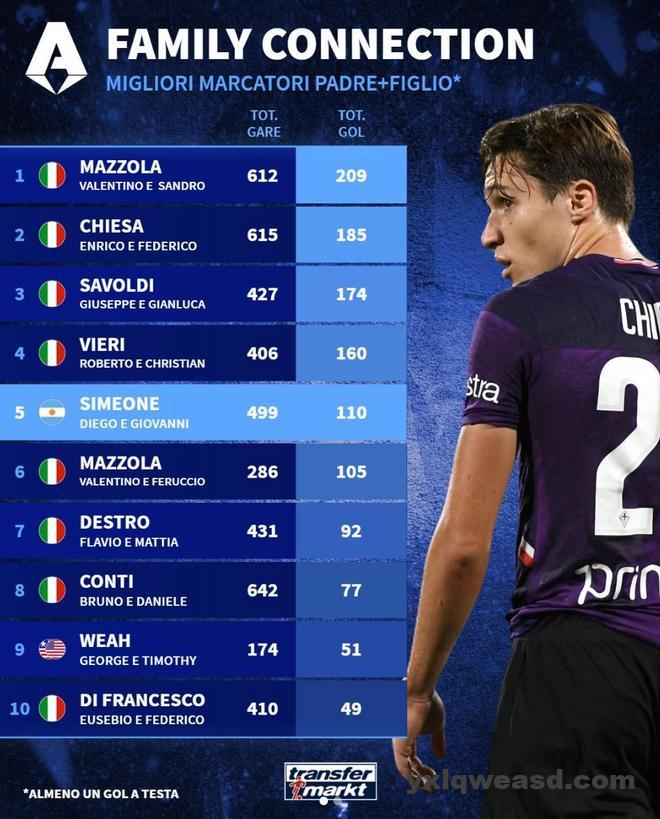 北京时间3月22日,德转统计出了意甲历史父子进球榜前10,瓦伦蒂诺和桑德罗-马佐拉父子209球排名第一,基耶萨、维埃里、西蒙尼、维阿以及迪弗朗西斯科父子上榜。