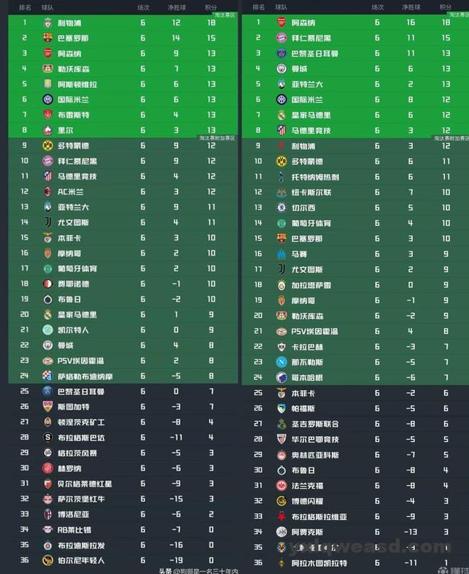 与去年相比同期欧冠战罢六轮之后的积分榜相比较,如下: