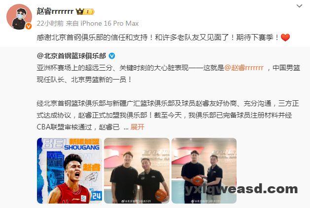“2025男篮亚洲杯后,经过北京首钢俱乐部和新疆广汇男篮俱乐部的协商,我的职业生涯迎来又一个新的转折点,即将在首钢俱乐部开启又一段新的征程。我尊重和服从俱乐部的最终决定,也感谢双方领导的信任和托付。对我来说,新的起点,新的征程,在未来的日子里,我将勤勉履职,竭尽全力和队伍团结奋斗,冲击更好的成绩!”