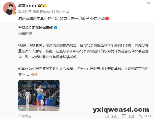 赵睿在前一天针对新疆男篮的致谢,他简短回应表示:“感谢新疆两年真心的付出,希望大家一切都好,各自健康。”