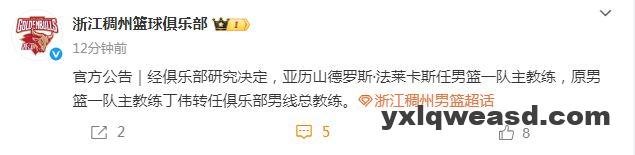 如今浙江男篮官方公告写道:“官方公告|经俱乐部研究决定,亚历山德罗斯-法莱卡斯任男篮一队主教练,原男篮一队主教练丁伟转任俱乐部男线总教练。”