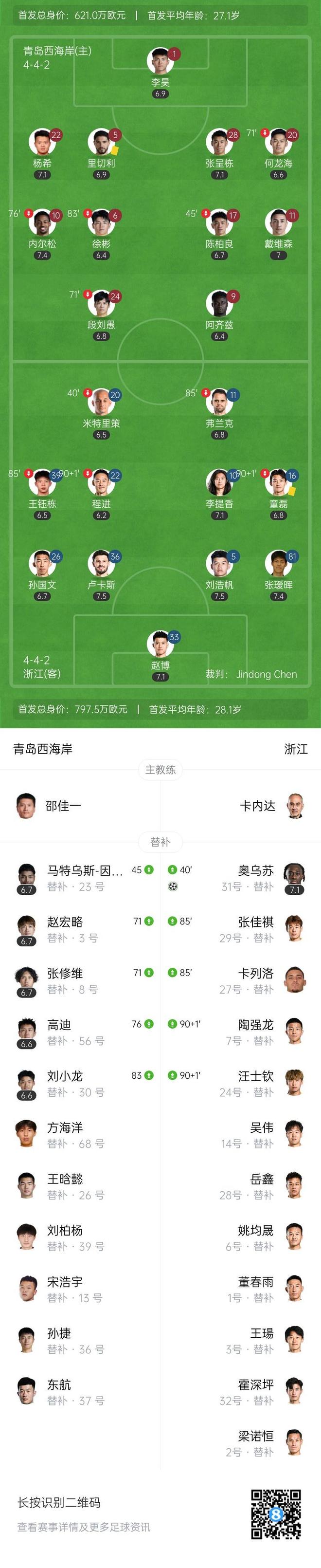 下半场补时6分钟。最终全场比赛结束,青岛西海岸0-2浙江队。